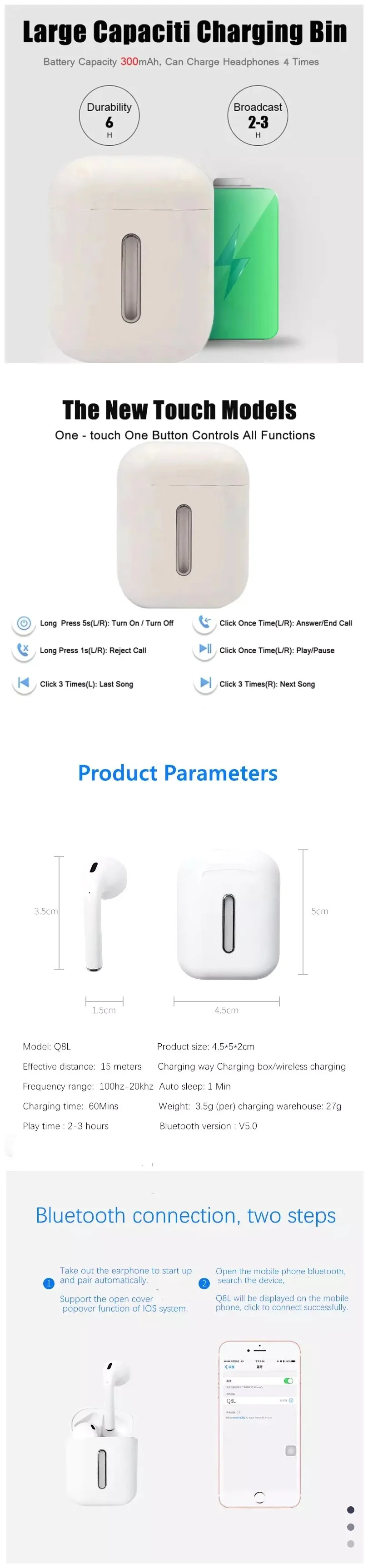 Earphone use steps:1、Open the top cover of the charging box and take out the earphone.The earphone will power on and paired automatically.2、Pairing with other devices:turn on the Bluetooth devices,search for Bluetooth name of "Q8L", click to connect to it.3、When the earphone is placed in the charging box,it will automatically power off and enter charging mode .The charging will automatically pause when the earphone is fully charged.4、Both earphone could work independent.5、If the earphone are not connected to other devices within 3 minutes, it will automatically power off.Warnings:1、Please do not overuse this earphone or put it under heavy pressure.keep away from wet heat.2、Keep away from WIFI,router or other high frequency transmitting equipment to prevent interruption of signal receiving.3、Please use this earphone under its working range(10-25m),and the effect would be better if there is no obstacle between the connected devises.4、Use this bluetooth earphone to connect any deviae with bluetooth function.5、Do not place the product in an environment that is too hot or too cold.Setting it at temperatures above 50 degrees Celsius or below 10 degrees Celsius will affect battery performance.
