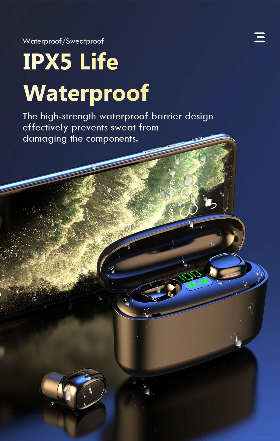Product Features:1, Bluetooth V5.0, support most of bluetooth devices and lower power consumption2, 2200mAh charging case can full charge 2 earphones around 15 times, offer more music time.3, With waterproof technology, no need to worry about water and sweat anymore4, 8mms dual drive units, enjoy 6D strong deep bass music sound 5, Popular one button control function, support switch songs, phone call and call voice assiatant.Accessories Lists:2* Bluetooth Earphones1* Charging Case1* USB Cable1* User Manual2* Earphone Cups(L,M Size)