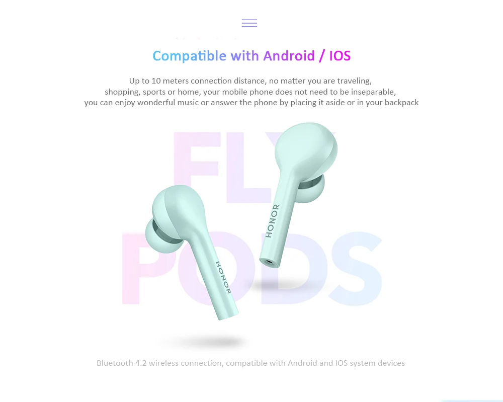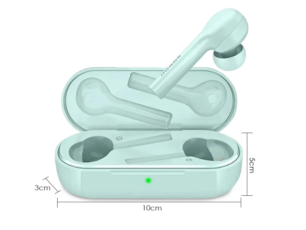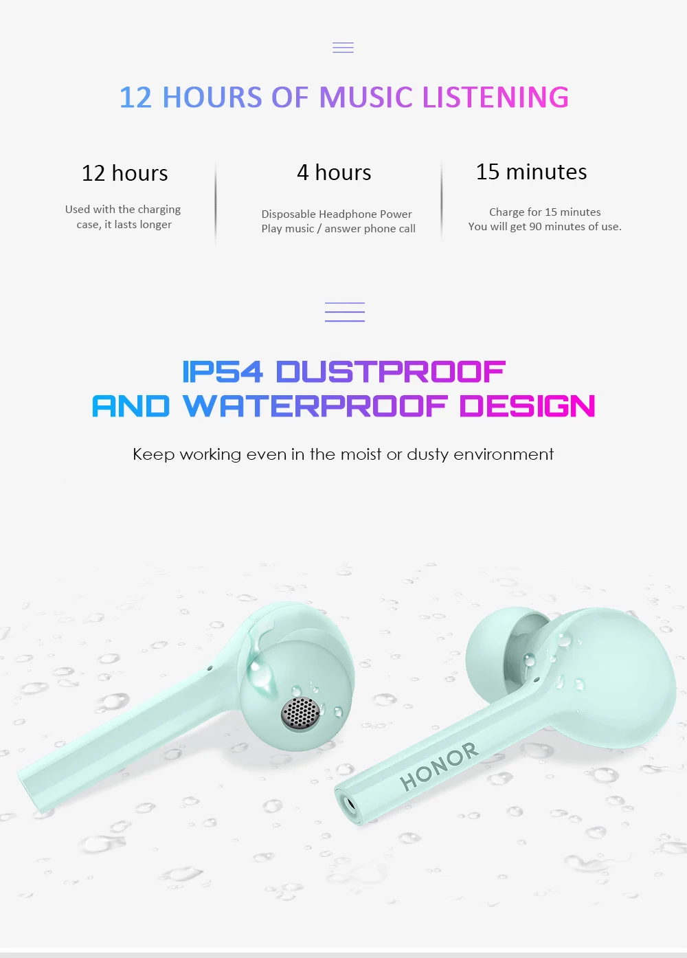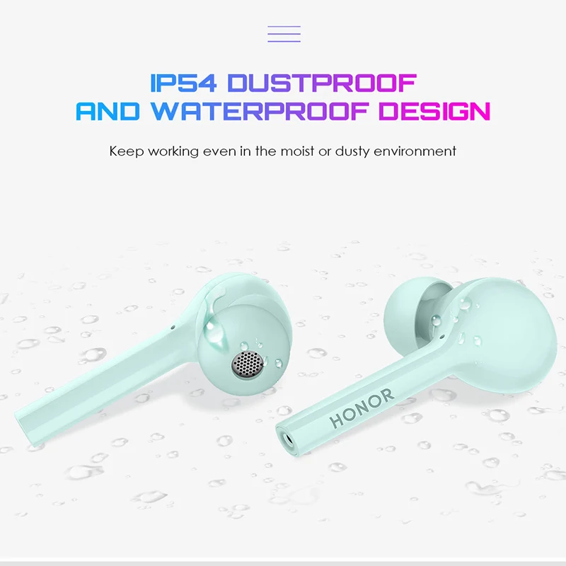 Description: This Honor FlyPods Lite wireless earphones will bring the amazing sound and more convenient way to your life. Your ears will feel more freedom.Features:Bluetooth 4.2 Handsfree Earphones:The FlyPods Lite connect via Bluetooth 4.2 connecting the ear buds to your phone is simple and easy after the very first pairing. All you have to do is flip open the case of the ear buds and a prompt shows up on the screen with details about the ear buds including its current battery level and a request to pair. In ear style, very convenient when driving and doing sports.IP54 Rating Waterproof:The FlyPods Lite has an IP54 rating so sweat and rain shouldn't damage them.55mAh Battery:The earbuds have a battery capacity of 55mAh and Honor says they should last 4 hours on a single charge and up to 12 hours with the charging case. The case charges via a micro USB port and can also be charged wirelessly.Touch Controls: The FlyPods Lite has touch controls. The left earbud can be used to activate the voice assistant while the right earbud controls media playback. Both earbuds can be used to answer and reject calls.Pair Key: Use it in the first time, press it in 2 seconds, charging box will be turned on.When the earphone is in the charging box, press pair key in 2 - 10 seconds, the earphone will be in the status of pairing. When the earphone is in the charging box, press pair key over 10 seconds, the earphone will recover factory settings.Specification: Bluetooth: Bluetooth 4.2Bluetooth Protocol: A2DP 1.3; hands-free configuration (HFP) 1.6; earphone configuration (HSP) 1.2; AVRCPSupport Music: play effective frequency bandwidth 20 Hz - 20000 HzIndicator Light: tricolor lights (red, blue, green)Charging Interface: the earphone is charged by the charging box; the charging box has a micro USB interfaceColor: Black,Blue,WhitePackage weight: 0.234 kg Package Size(L x W x H): 10.00 x 5.00 x 3.00 cm / 3.94 x 1.97 x 1.18 inchesPackage Contents: 1 x Pair of Earphones, 1 x Charging Box, 1 x USB Cable, 1 x Pair of Big Ear Caps, 1 x Pair of Small Ear Caps, 1 x Pair of Sports Ear CapsIPXX Rating ChartIP Code The IP Code (or International Protection Rating, sometimes also interpreted as Ingress Protection Rating*) consists of the letters IP followed by two digits and an optional letter. As defined in international standard IEC 60529, it classifies the degrees of protection provided against the intrusion of solid objects (including body parts like hands and fingers), dust, accidental contact, and water in electrical enclosures. The standard aims to provide users more detailed information than vague marketing terms such as waterproof.The digits (characteristic numerals) indicate conformity with the conditions summarized in the tables below. For example, an electrical socket rated IP22 is protected against insertion of fingers and will not be damaged or become unsafe during a specified test in which it is exposed to vertically or nearly vertically dripping water. IP22 or 2X are typical minimum requirements for the design of electrical accessories for indoor use.