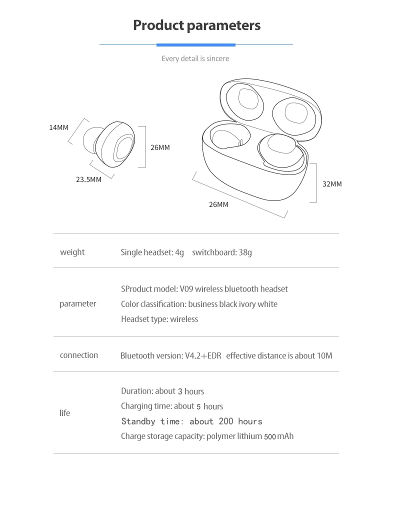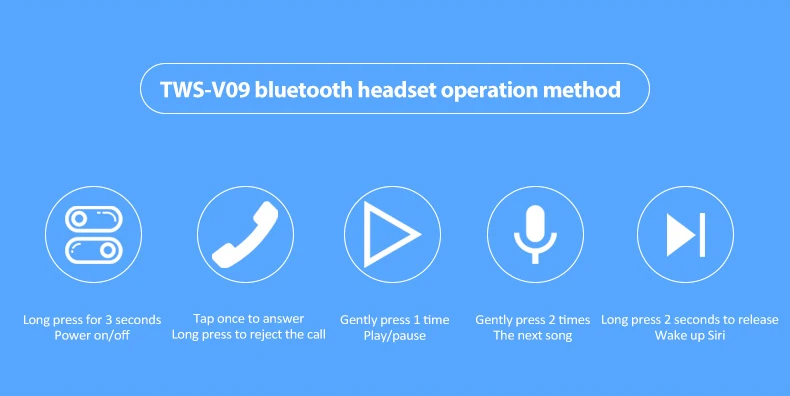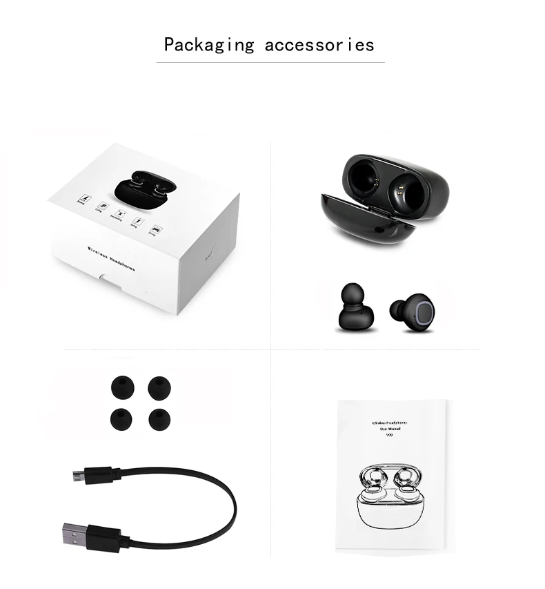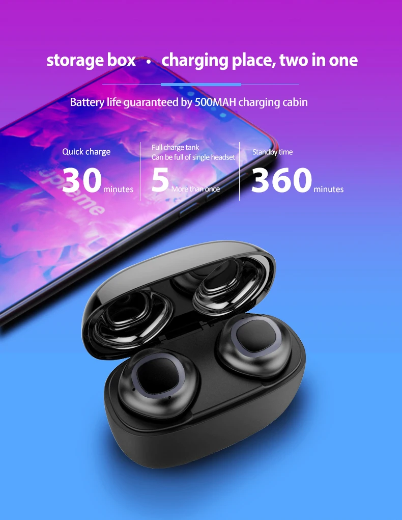 (1) Headphone charging. The charging box has built-in battery. When the charging box is fully charged, the earphone is put into the charging box, then the earphone can be charged. When the earphone is in the charging state, the earphone is bright red LED light, the charging box is bright blue LED light; when the earphone is When the charge is saturated, the blue light is on for 1 minute, then the LED light is automatically turned off (not lit), and the blue light of the charging box will be automatically turned off (not lit). When the cover is used for the first time (or when it is not used for a long time), the power of the charging box may be limited. Before use, please place the earphone in the charging box. The USB charging port of the charging box is connected to the USB cable, which can be used for both the headset and The charging box is charged (open the lid or close the lid, the charging box can charge the headphones).