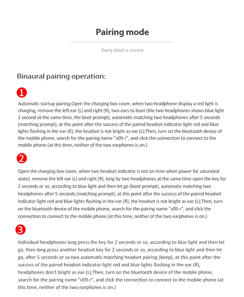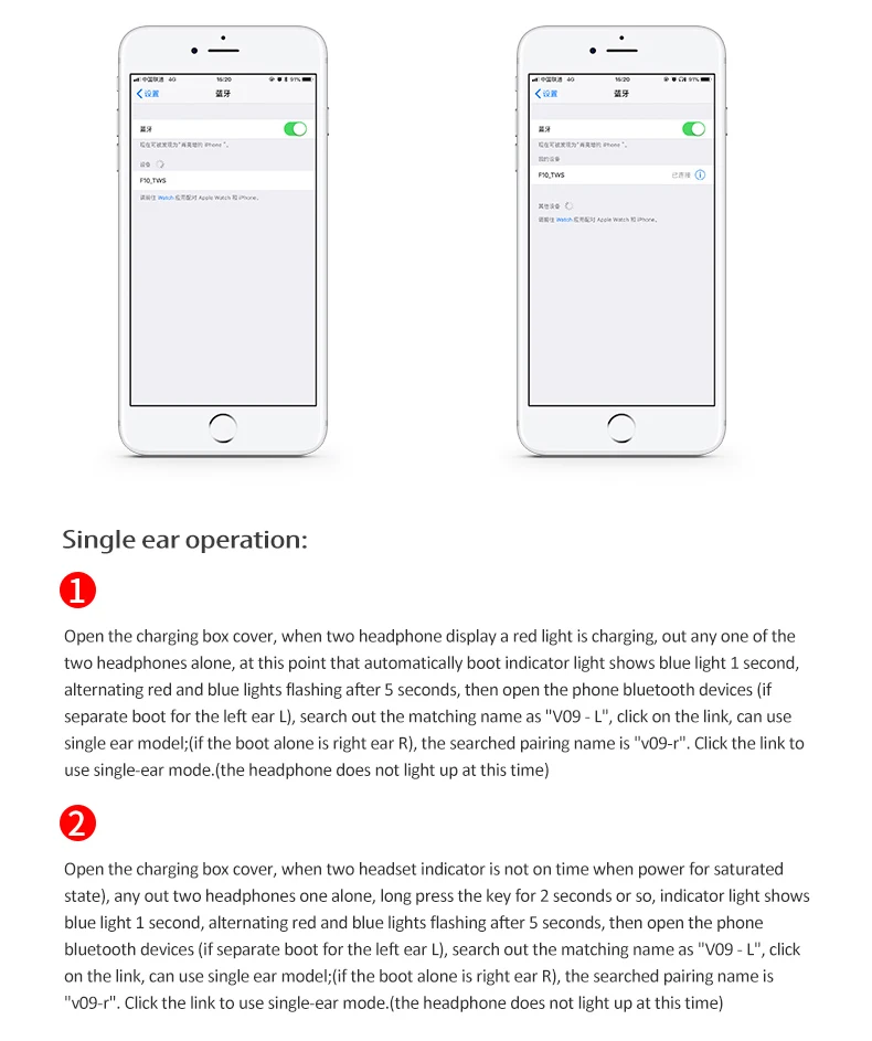 (2) Charging box charging. When the power of the charging box is too low or no power, connect the USB cable to charge; when the charging box is in the charging state, the red light flashes. When the charging box is fully charged, the red light is always on.