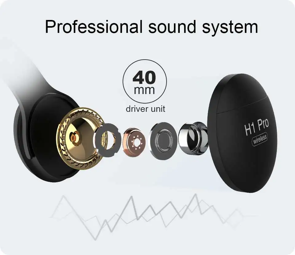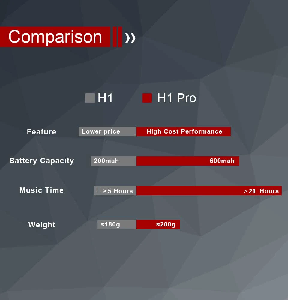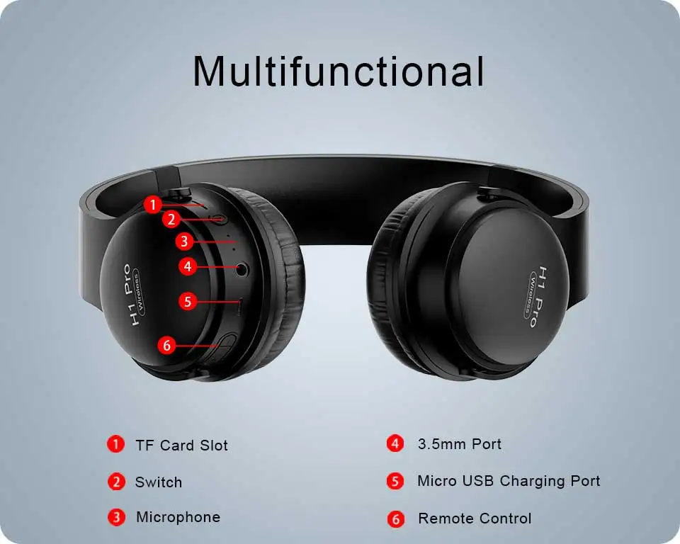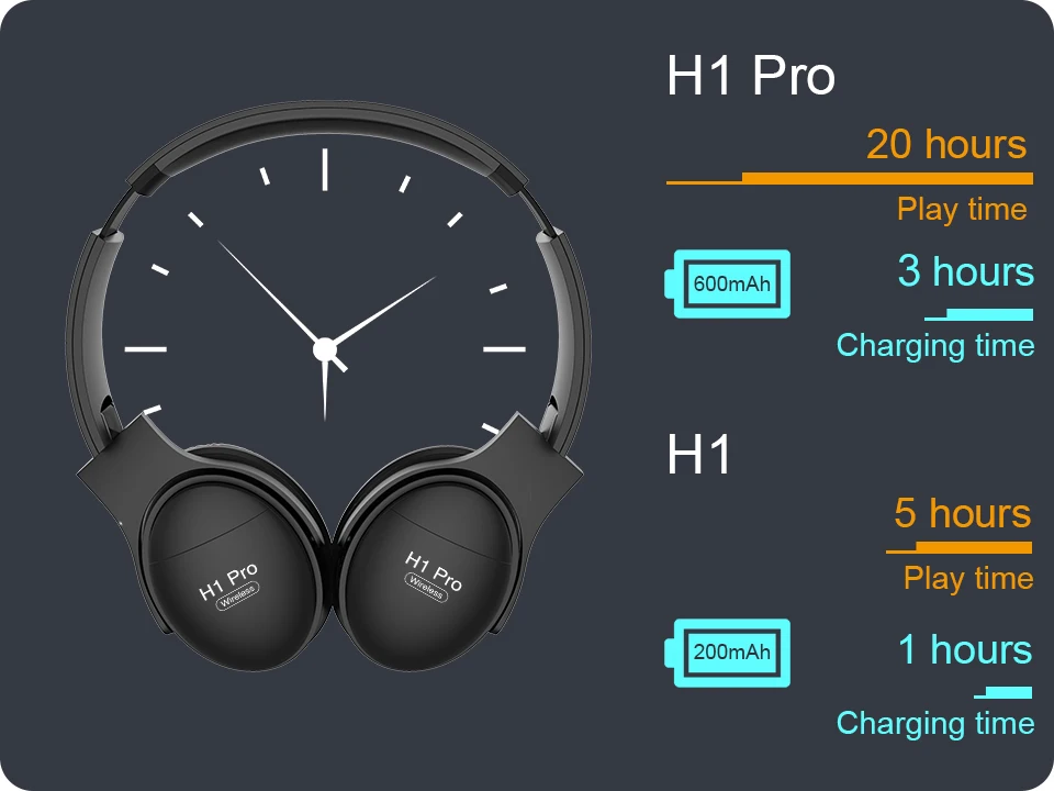 1.Impressive Sound:The High-fidelity stereo sound benefits from the 40 mm powerful driver. And the around-ear cushion design take you lose in the music! 2.Support Wireless&Wired: The wireless mode: Battery update to 20 hour(H1 Pro) music time/talking time in a single charge. The Wired mode: you can also use it as a wired headphone with the provided audio cable.3.Portable Adjustable Design:The adjustable Headband is not only designed for saving your desk space but for carrying in the provided bag.