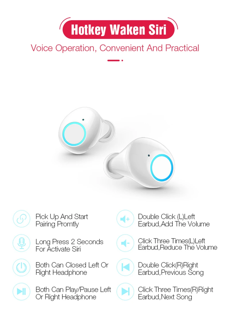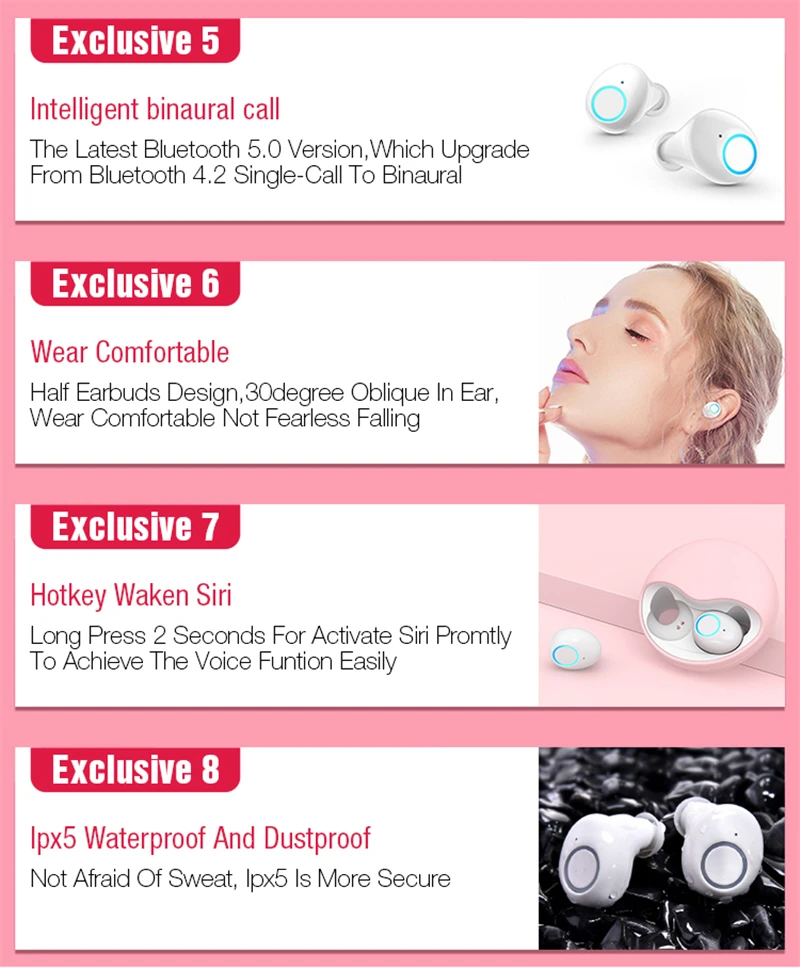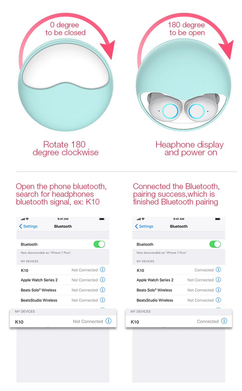 Headphones are automatically paired, support left ear and right ear interconnection, left channel right channel independent callSingle can also be used as a stereo Bluetooth headsetWireless call, wireless music playbackLeft and right ear control pauses playback, next switchIPX5 waterproof functionLong press for 2 seconds to wake up the Siri functionCreative and intelligent design: Rotate the case to open the phone automatically, close the case and automatically close the connection and start charging
