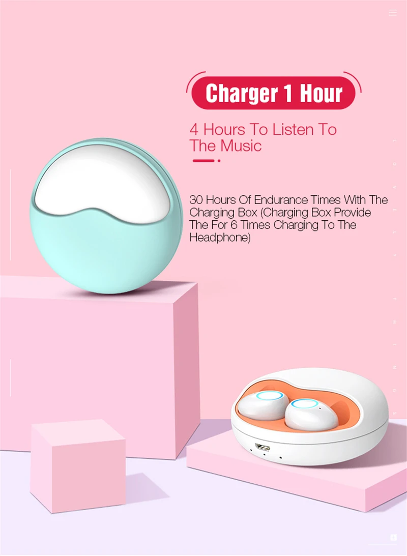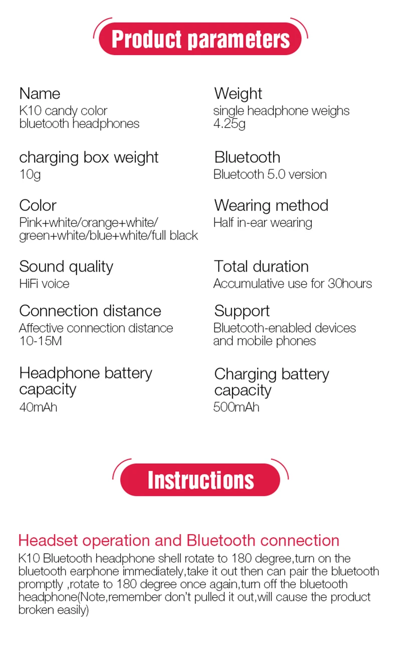 Outer Material: ABSBluetooth 5.0+EDRCall time: 4-6 hoursMusic time: 4-8 hoursStandby time: 60 hoursEarphone Battery Capacity : 3.7V/40 mAh (Single)Earphone Charging Time : 1-1.5 hoursBox Battery Capacity : 3.7V/500 mAhBox Charging Time : 2 hoursSingle Earphone Weight : 4.2g/PCChannel: StereoBluetooth transmission distance: 10 metersEarphone Size : 2.3*2.1*2.0 cm