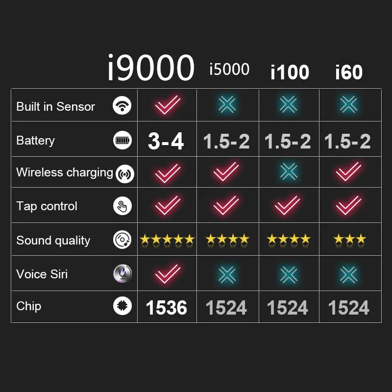 Original i9000 TWS 1:1 In-ear Bluetooth 5.0 Earphone Wireless Headphone headset PK W1 H1 Chip Aire2 audifono para celular elariHave in-ear smart sensor or internal ear detection sensor.NEWEST Upgraded Features :1.Open the lid to connect (pop up animation when connect with ios)2.100% 3 real battery on ios (2 earbuds and charging case)3.Air2th 1:1 size 4.Support Qi wirelss charging5.Auto power on and power off6.Could be used separately or together7.8D hifi stereo8.Binaural call9.Bluetooth 5.010.Tap controlConnect with IOS device :1.Open the lid of case and turn on the bluetooth on device , the pop up function will work . And you will see a notice to press the button on the back of charging case .2.Long press(about 4s) the button , you will see the white led blink . And the earbuds will connect with phone automaticallyConnect with Android or other device :1.Open the lid of case and long press(about 4s) the button until make sure that the white led on the charging case blink .2.Turn on the bluetooth on device to found the earbuds bluetooth signal to connect .Package list: 1*charging box 1*tws earphone 1*use manual 1*charge cable 1*package box