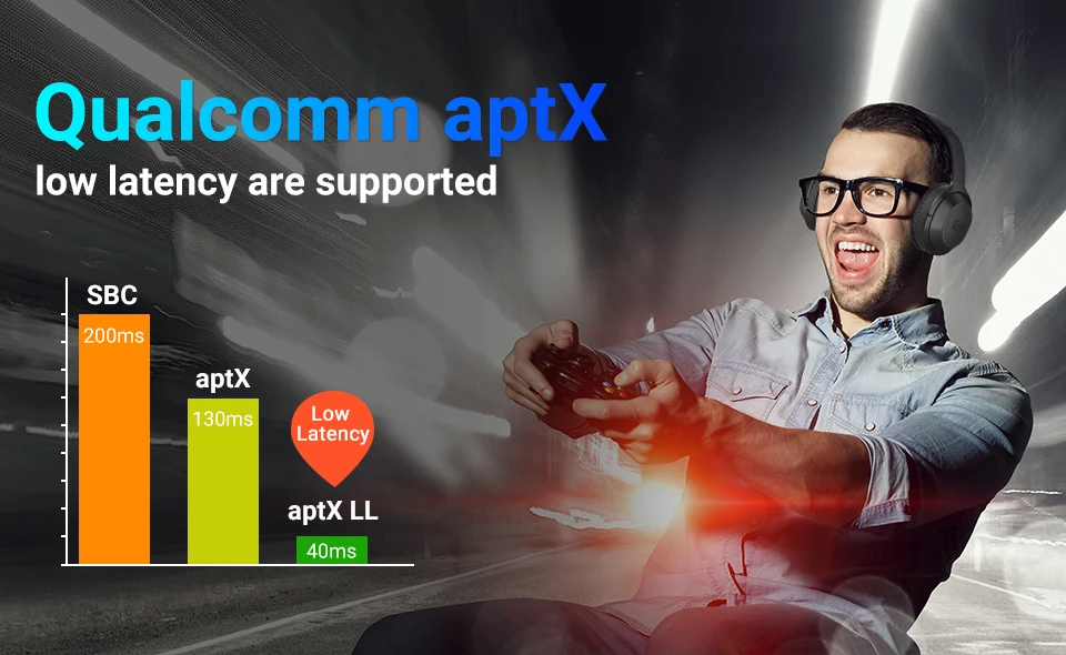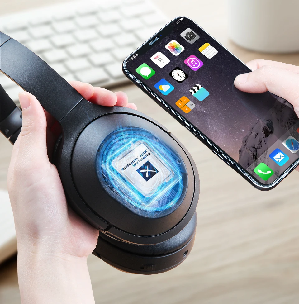 BT25Pro adopts the most premium chipset of QCC 3005, and is one of the few Bluetooth V5.0 headphones in the market which can truly support the codec of aptX Low Latency (simplified as aptX LL).It offers easy & fast pairing with smart phones/tablets/PCs, and allows you to enjoy aptX high-fidelity sound with brilliant treble, smooth mid-ranges, and deep bass.