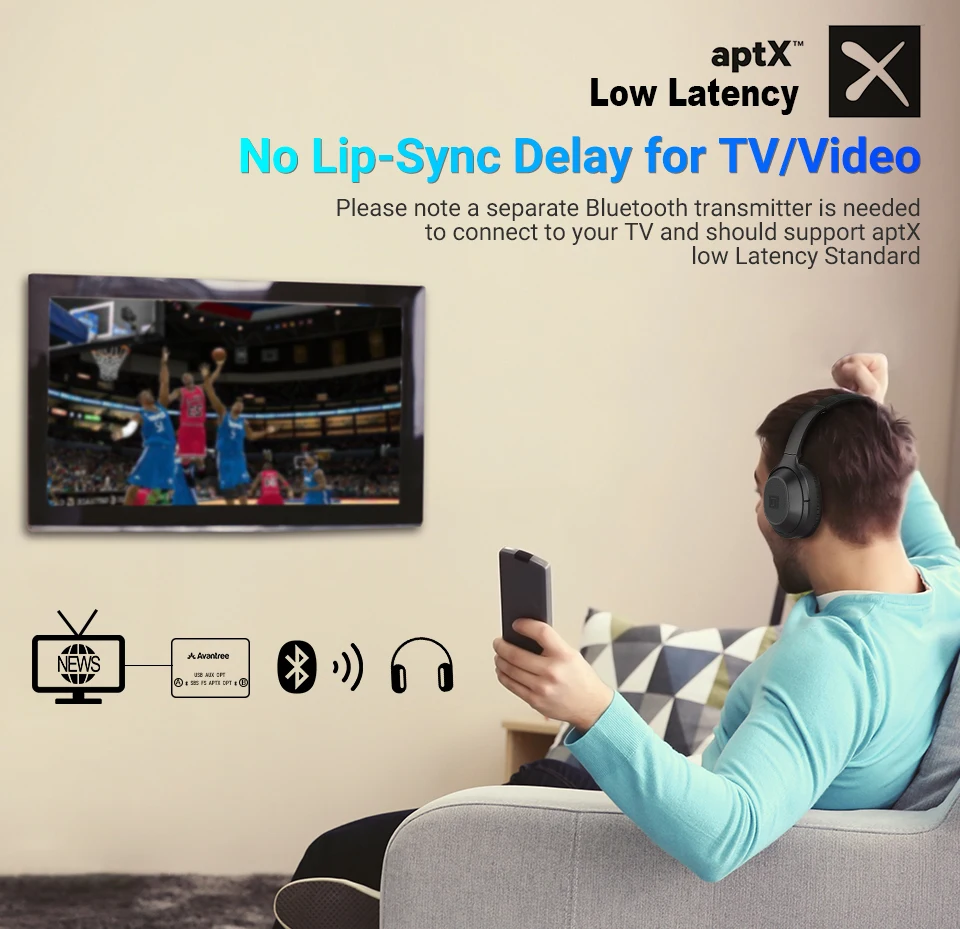 You could connect it to a separate Bluetooth transmitter, and watch late TV night shows without disturbing your family members. In order to avoid any potential audio lag, your Bluetooth transmitter needs to support aptX LL as well.PS: BT25Pro is not a pair of 2.4G RF wireless headphones. You do need to order an additional Bluetooth transmitter (such as TROND BT-DUO series) in order to stream your TV audio out to the headphones.