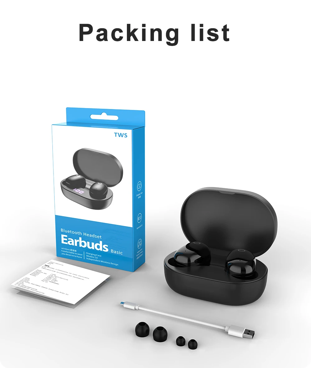 1.Charging box; 2.Earbudsx2; 3.Earbuds capx2 pairs; 4.Charging Cable ; 5.Manual