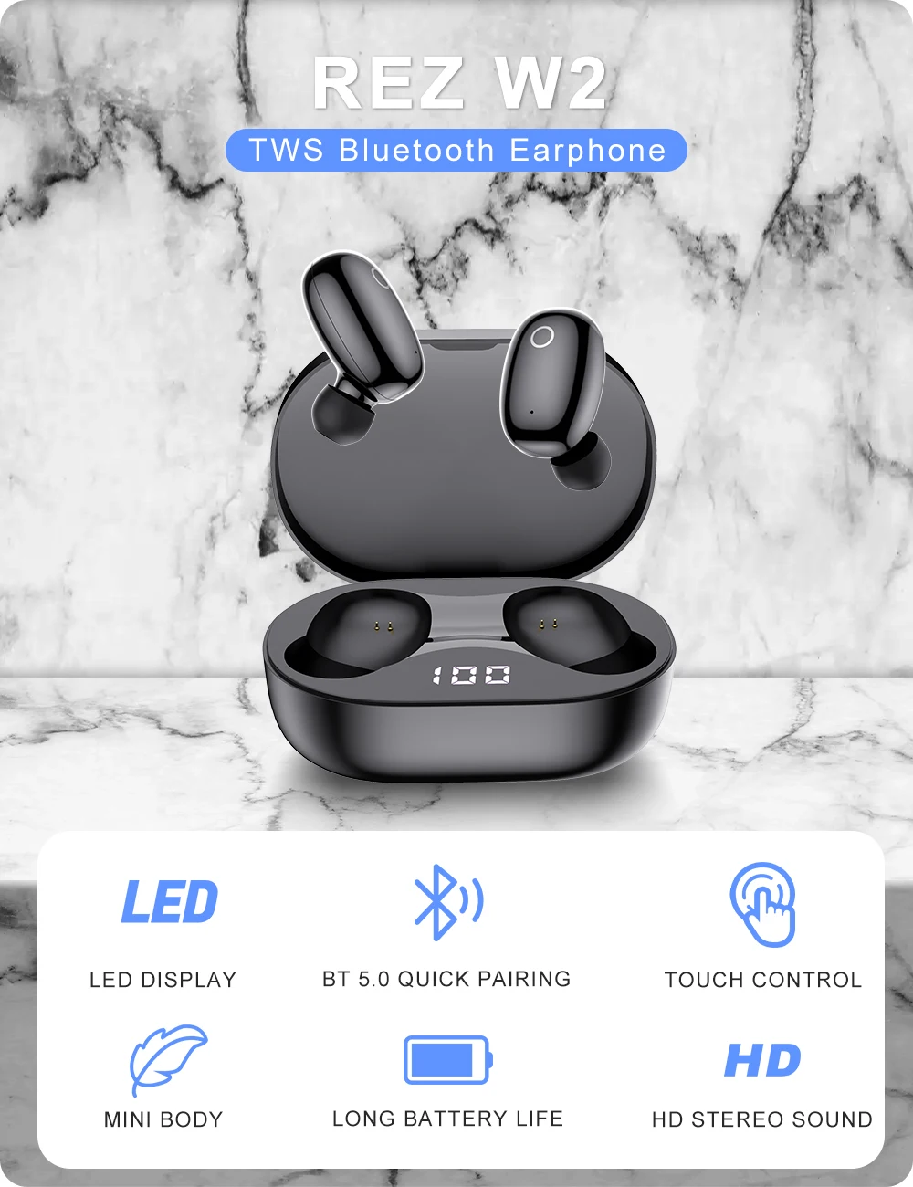 | REZ W2 TWS Touch Control Bluetooth 5.0 Earphones Sports Music Wireless Earbuds Headphone Noise Cancelling Gaming Headset |